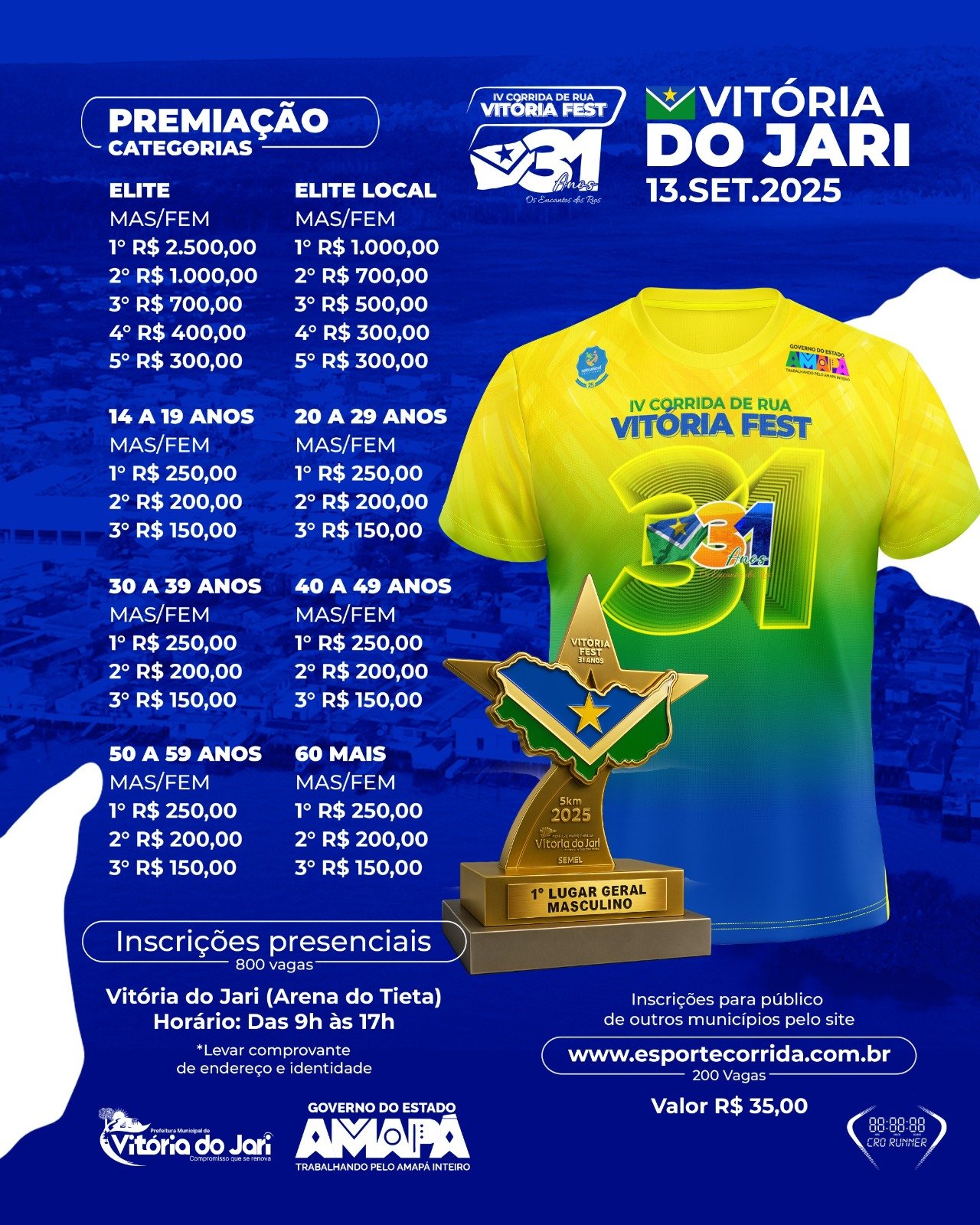 Regra Especial: Atletas com mais de 60 anos têm direito a 50% de desconto na inscrição, conforme lei federal, mediante comprovação na retirada do kit.