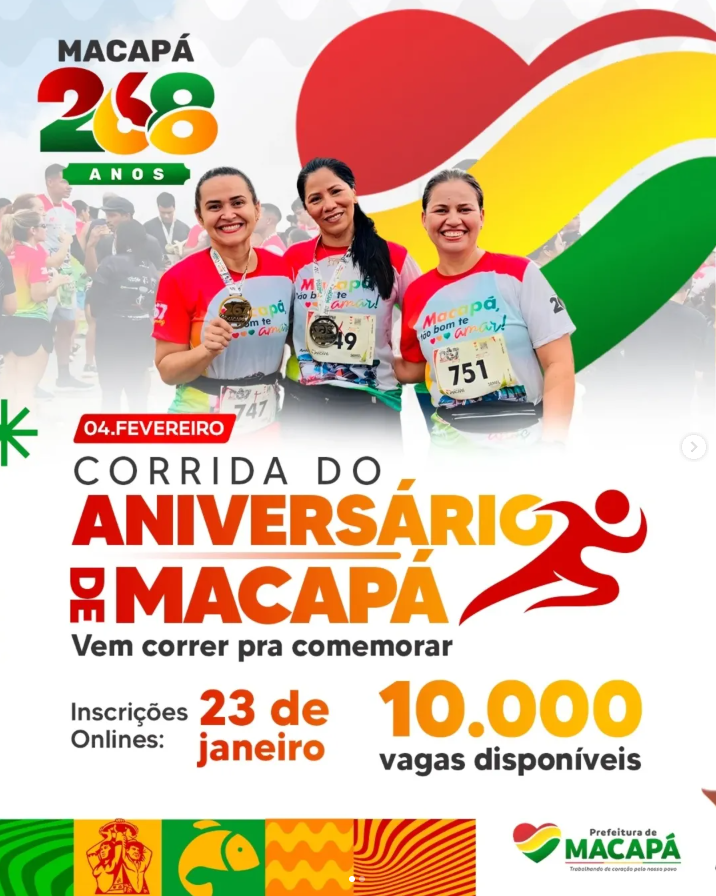 No dia 4 de fevereiro, a Prefeitura de Macapá realizará a tradicional Corrida do Aniversário, marcando os 268 anos da capital amapaense. Este evento esportivo, que já se tornou um símbolo de pertencimento e celebração coletiva, terá um percurso de 8 km, com largada às 5h30 da manhã no Parque Meio do Mundo e chegada na Praça Radialista Agostinho, na orla do bairro Perpétuo Socorro. As inscrições, limitadas a 10 mil vagas, serão abertas no dia 23 de janeiro e realizadas exclusivamente online.