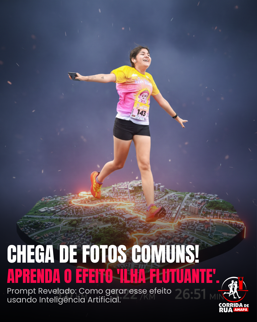 Integre de forma artística os dados principais da atividade do Strava (distância total 5 km, ritmo médio 2’22” e tempo de atividade 26:51 min) na base da plataforma, em tipografia moderna e tecnológica, com leve brilho. Mostre o corredor em movimento realista, em plena passada de corrida, com motion blur nos pés, expressão de foco e sensação clara de velocidade.
